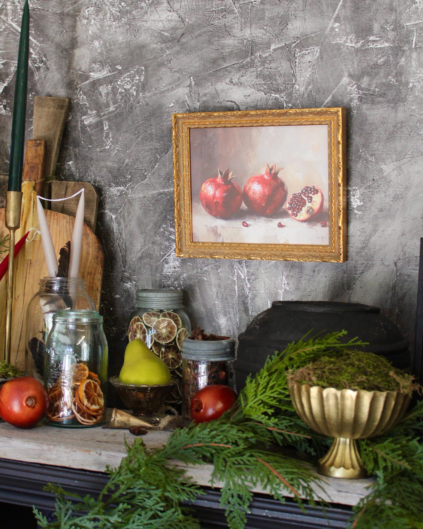 Antique Pomegranate Framed ArtPrints are here! Designed to replicate French antique artwork. These beautiful vintage-inspired prints are featured in an intricately crafted frame and finished with a bronzed patina, adding depth and character to your space. These art pieces are printed on a high-quality canvas with a soft velvet backing and a jagged gold hanger. The Antique Pomegranate Art Print showcases the fruits natural beauty with its rich, deep red tones and intricate texture.