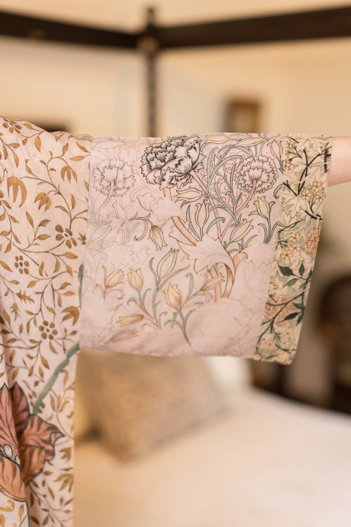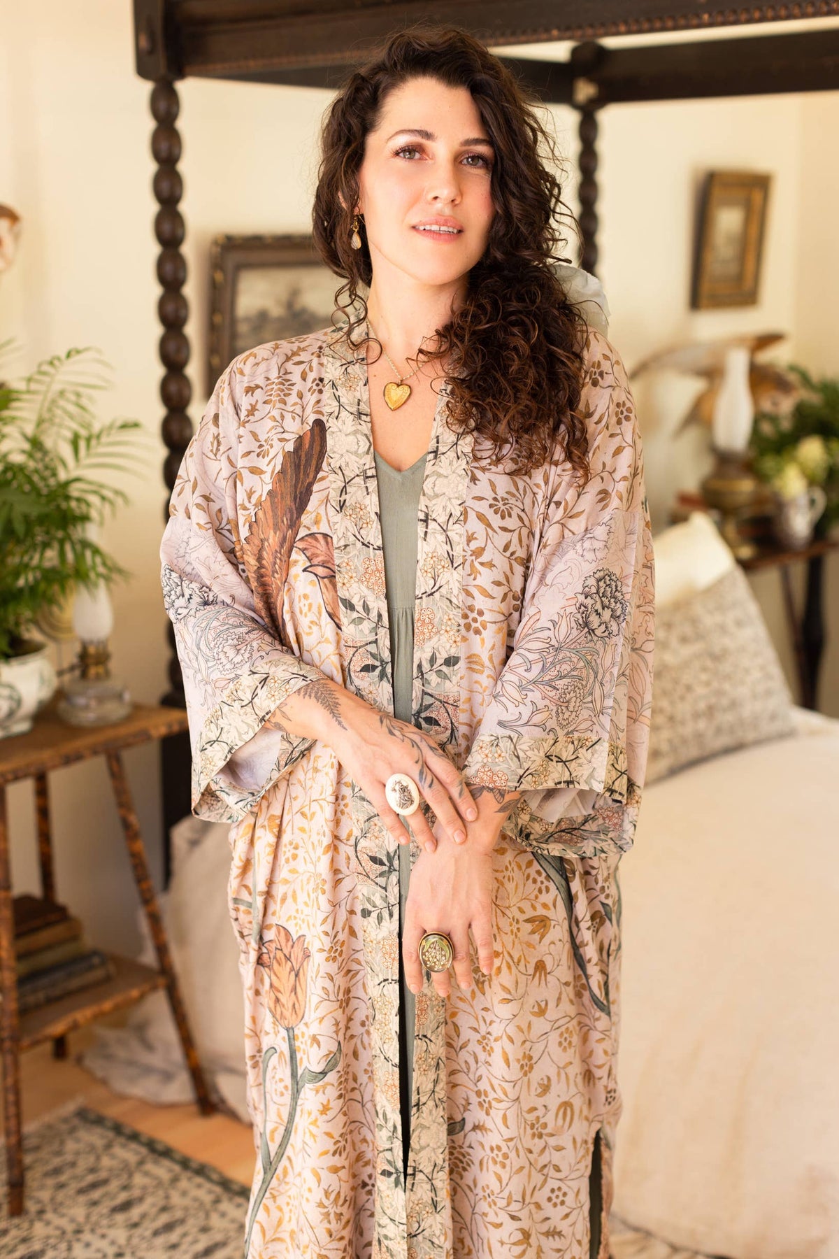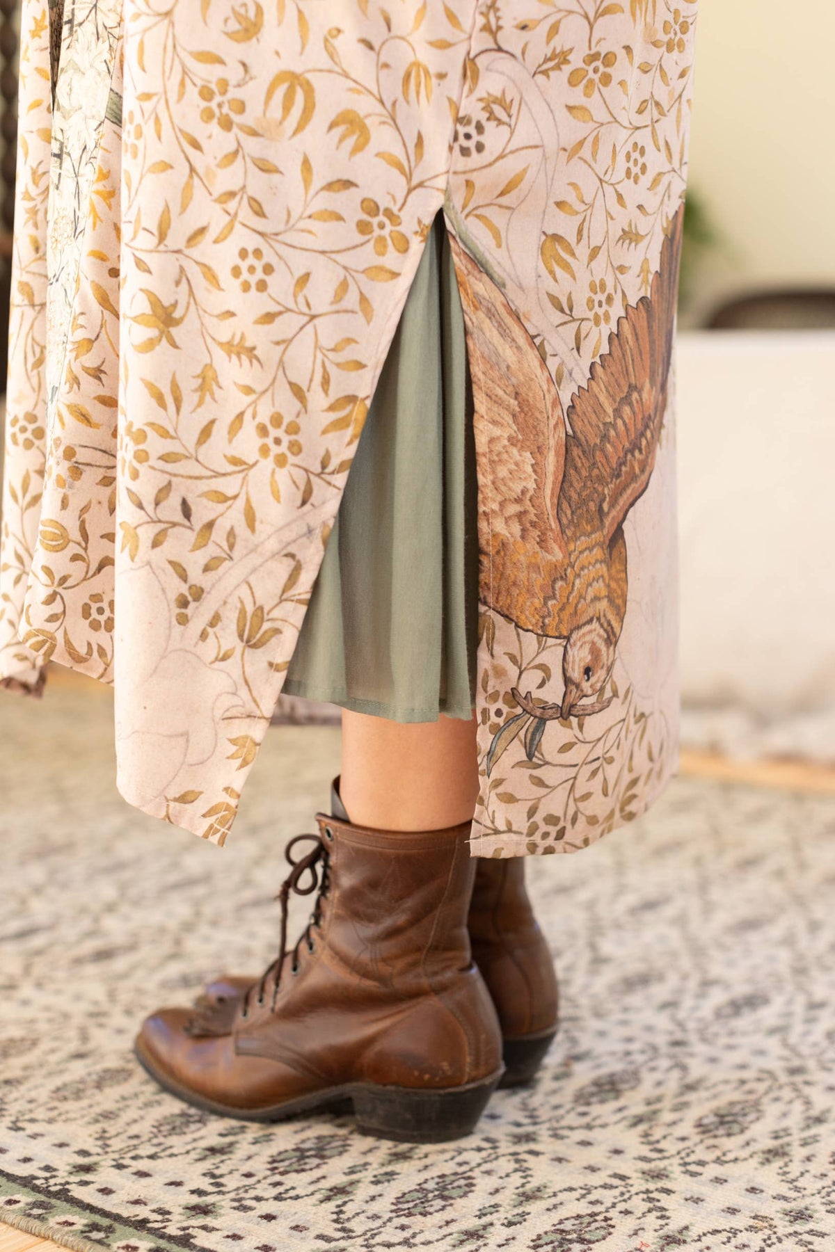 A fairy tale you can wear -- Folklore is our celebration of the Arts & Crafts movement, and our nod to the beauty of “non-finito” (art that is a work-in-progress). The printed Bird of Peace comes from an original hand stitched work by fibre artist Kim Donohoe, who used single-ply thread to capture every detail of plumage. The background panels come from unfinished works created in 1885 by British artist William Morris, whose original pencil sketch lines can be seen where the designs remain incomplete. We left these in intentionally, to celebrate the profound beauty of the artistic process! 100% viscose (derived from plant fibres such as wood and bamboo). Machine wash gentle or hand wash and hang to dry. Garment is FINAL SALE.