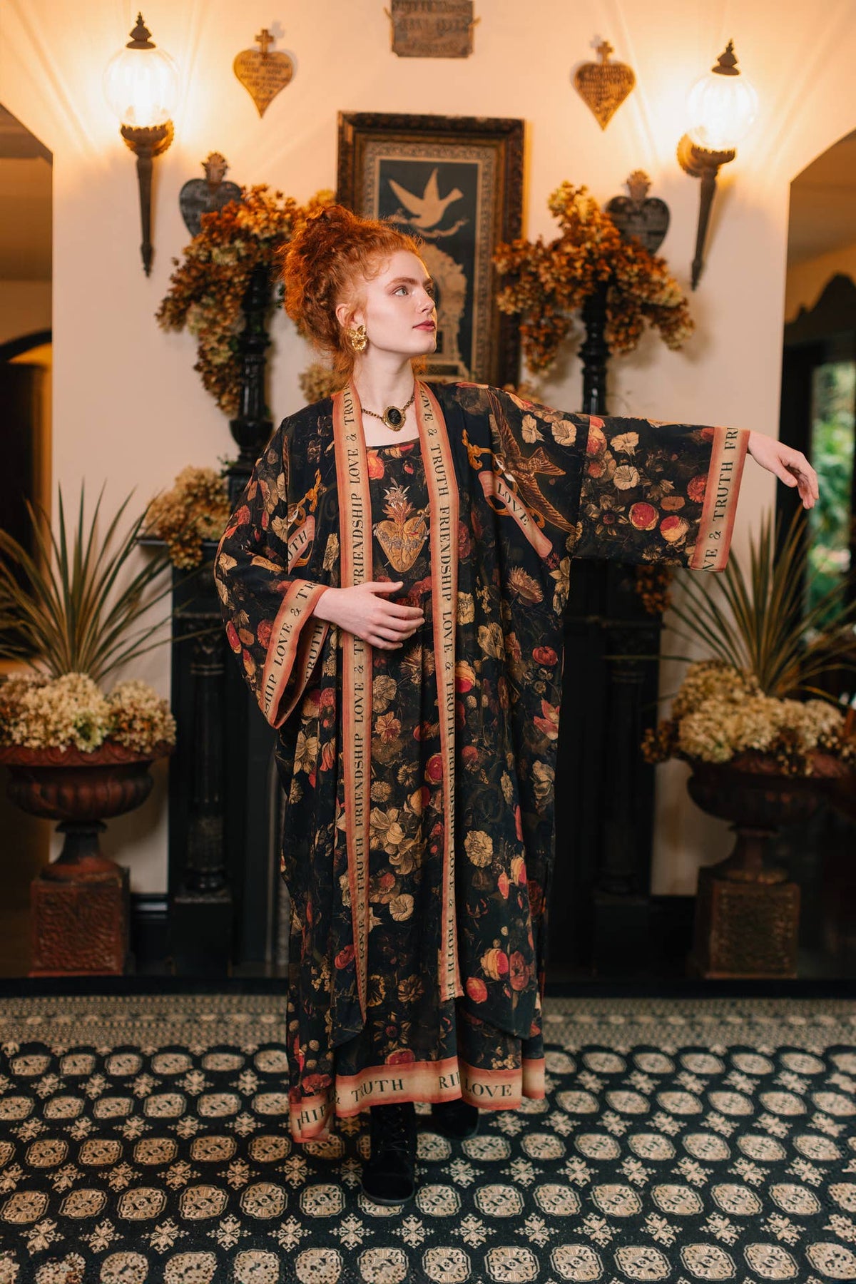 Introducing Heart of Gold — our beautiful & dramatic new collection that celebrates the bonds in our lives that endure — love, truth, and loyal friends! Designed using an intricate collage of antique artwork, it features hand-painted swallows from an 1865 scrapbook, floral wreaths done in the 1600s, and a very special sacred heart from Notre Dame in France, which was embroidered with gilded thread and completed in 1872. This print is rich in history, but also in meaning. The two swallows with wings outstretched (traditional symbols of loyalty) carry a ribbon between them as a reminder that even across distances, those we love will always be a part of us. The vintage banner proudly displays the motto “friendship, love, and truth”. Includes removable belt. 100% viscose (derived from plant fibres such as wood and bamboo). Garment is FINAL SALE.