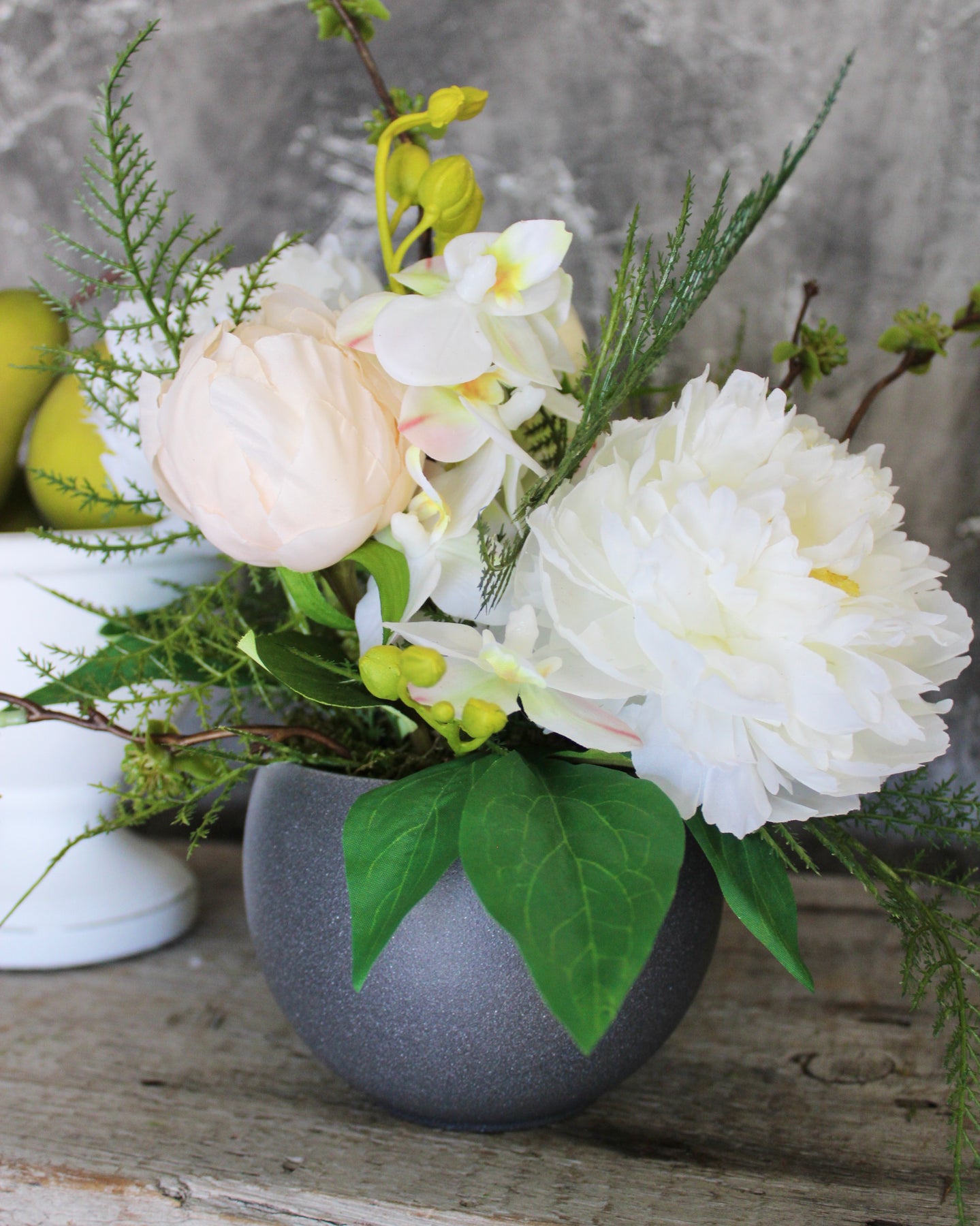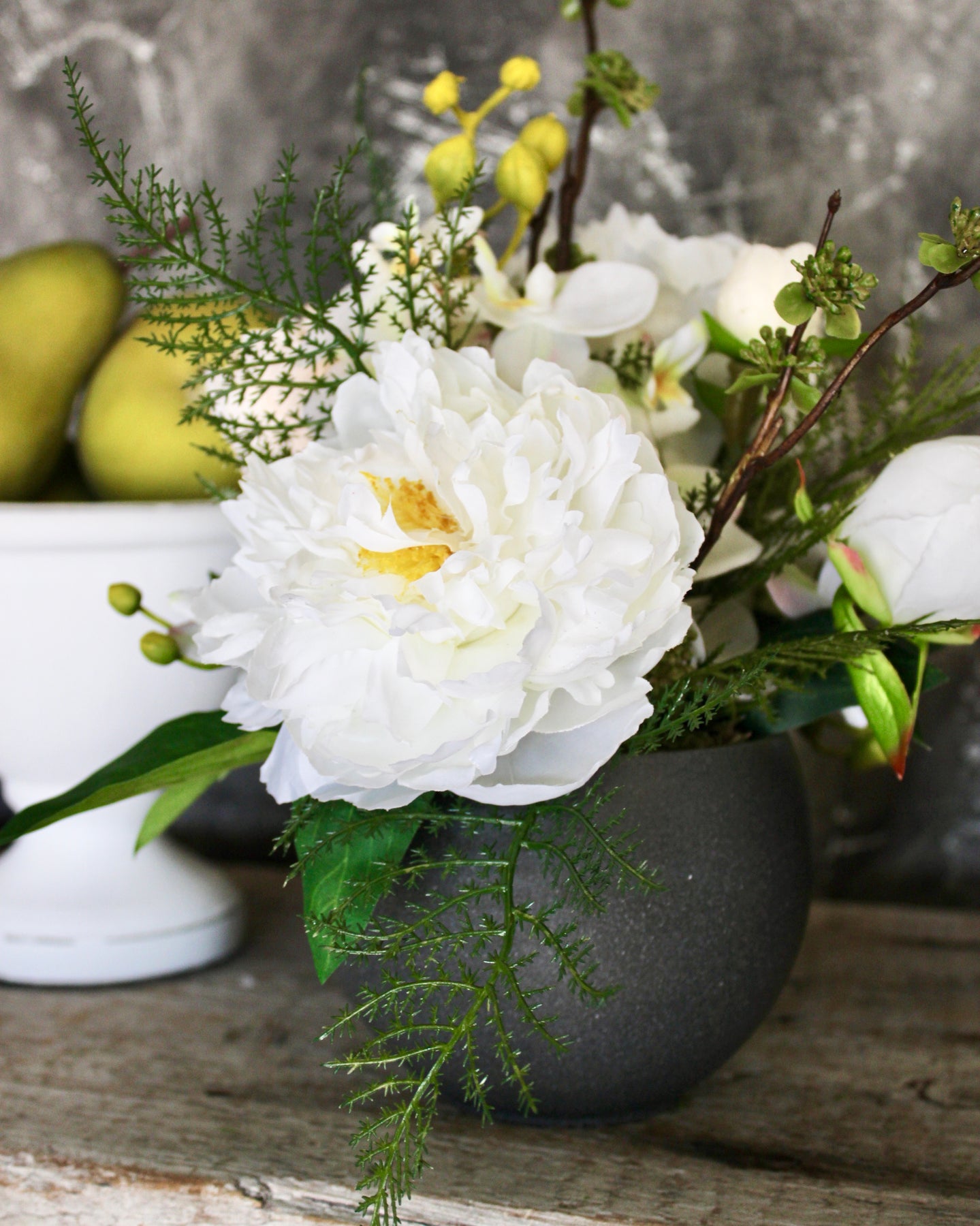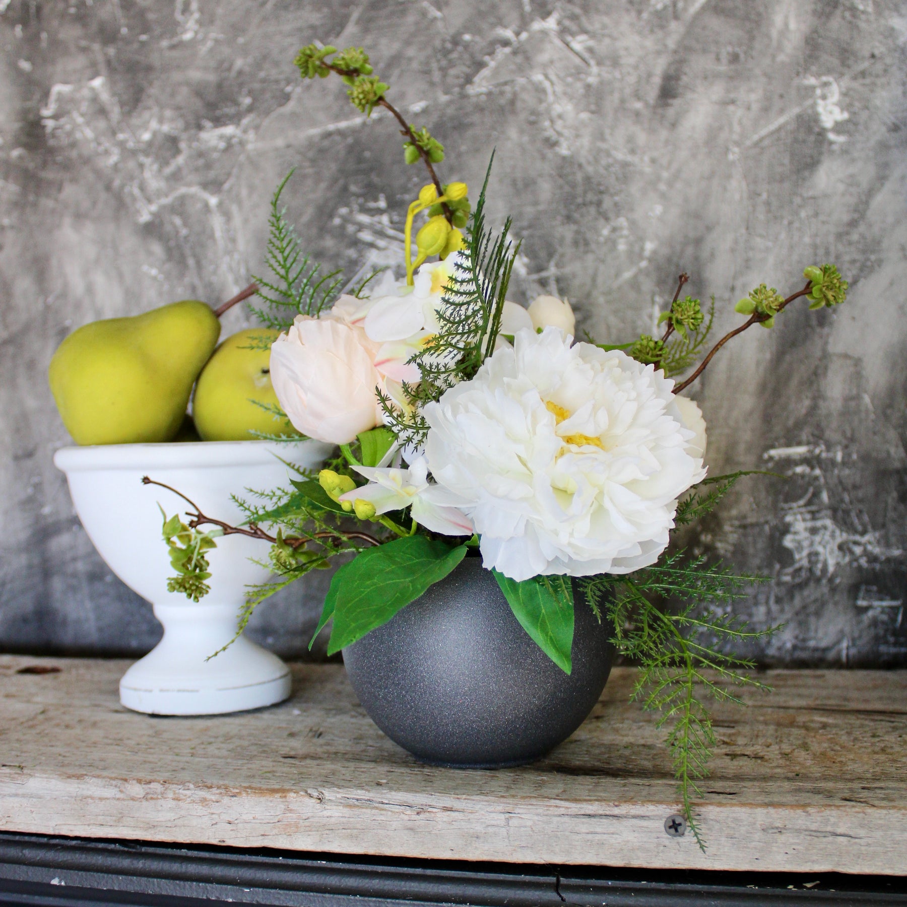 Bring timeless elegance to any space with this stunning potted peony arrangement. Featuring lifelike faux peonies in soft, romantic hues paired with lush assorted foliage, this piece captures the beauty of fresh flowers without the maintenance. Nestled in a charming spherical pot, it's the perfect accent for shelves, tables, or entryways. Measuring approximately 14" tall by 12" in diameter, this artificial arrangement offers year-round freshness and lasting appeal for your home décor.