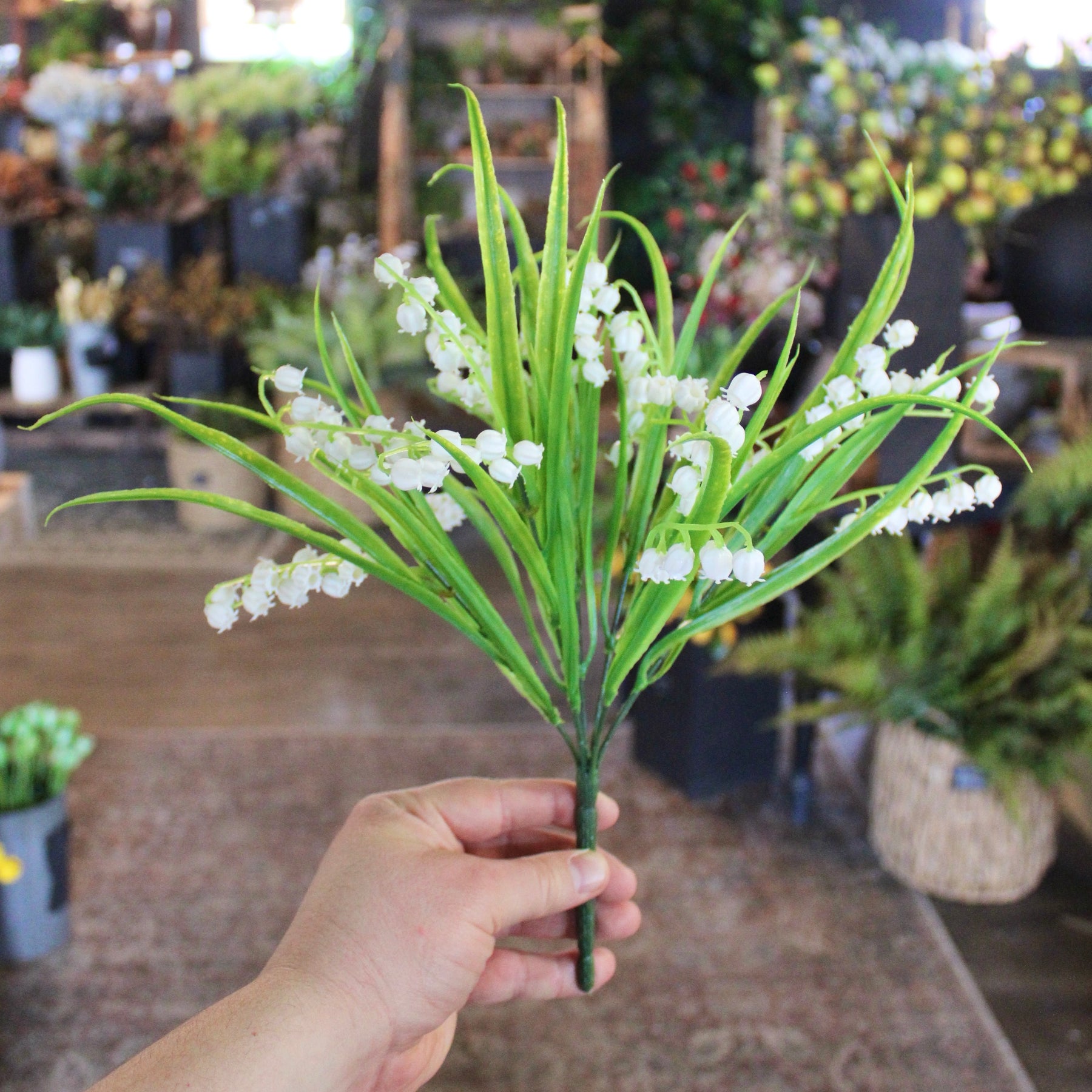 Delicate white bell-shaped flowers cascade gracefully from slender green stems, capturing the timeless elegance of lily of the valley without requiring water or maintenance. This faux botanical arrangement brings the refined charm of a classic spring bloom to any space year-round. Perfect for adding a touch of understated luxury to shelves, mantels, or tabletops, this lifelike bush maintains its pristine appearance indefinitely, making it an ideal choice for those seeking enduring botanical beauty.